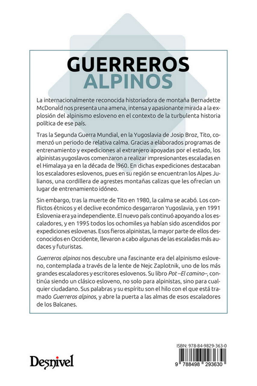 Guerreros alpinos es una amena, intensa y apasionante mirada a la explosión del alpinismo esloveno en el contexto de la historia política de ese país. Esta publicación recibió el Premio Literario de Montaña Banff de Historia de Montaña.